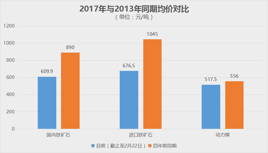 可以看出,盡管在2016年年底,煤炭價格經(jīng)過一輪瘋狂上漲,但由于此前跌幅過大,目前價格并未恢復到當初的水平。而原本漲幅居后的國內鋼價,在春節(jié)之后這一輪瘋狂拉漲之后,漲幅已經(jīng)后來居上。
