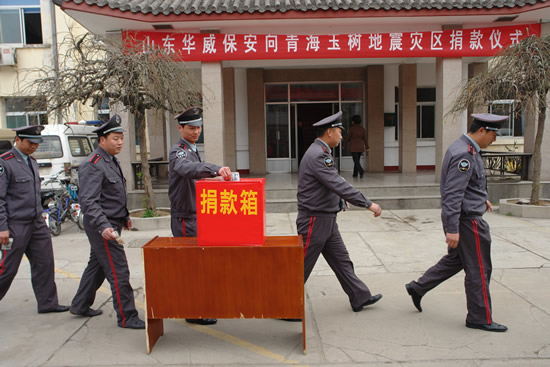 4月14日7時49分,青海省玉樹藏族自治州玉樹縣發生7.1級地震,災情牽動著山東華威保安公司全體員工的心。公司發揚“一方有難、八方支援”的優良傳統,號召全體員工向災區伸出援助之手, 4月19日上午,公司舉行捐助儀式,廣大員工踴躍向青海玉樹地震災區捐款,奉獻愛心,短短十幾分鐘募捐善款37105元,遠在上海、青島、日照分公司的保安員工也積極響應公司號召,踴躍捐款,表達了對玉樹災區人民的深情厚誼,以實際行動支援災區抗震救災,幫助受災群眾渡過難關、重建家園。