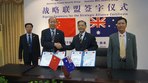 6月17日,山東華威保安集團與澳大利亞MSS保安集團正式簽署戰略聯盟合作協議,分享跨國公司服務標準,聯手開發海外安保服務市場,這是我國保安首次與國外保安同行進行戰略合作,此舉對于加快華威保安的跨越發展將產生深遠的影響。山東華威保安集團董事長、總裁荀金慶、澳大利亞MSS保安集團總裁陳喬治分別在協議上簽字。曲阜市副市長劉秀廣、曲阜市公安局局長榮民等領導出席了簽字儀式。
