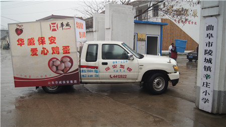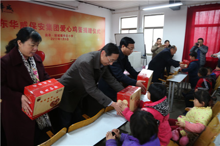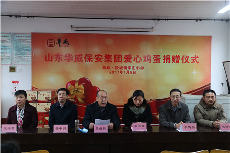 1月5日,冒著料峭的冬雨,華威全體員工堅守了七年的“愛心雞蛋”又如約來到了曲阜市陵城鎮莘莊小學。曲阜市關工委副主任、秘書長張繼鵬,陵城鎮有關領導,集團常務副總裁楊中河、黨總支副書記李曉虎參加了捐贈儀式,代表華威保安集團為小朋友們帶來了濃濃愛心。