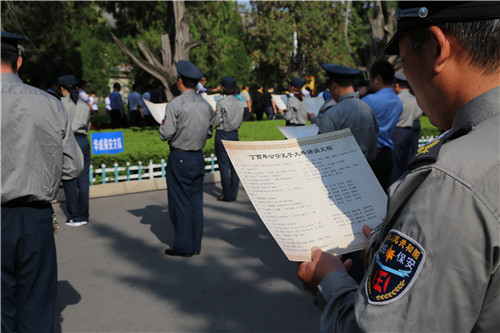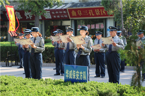 9月28日,值孔子誕辰2568年之際,山東華威保安集團的60名保安隊員在曲阜孔廟萬仞宮墻前,參加第34屆中國國際孔子文化節群眾方陣經典誦讀活動。