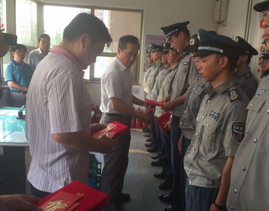 山東科技大學項目部成立以來,一直以服務科大為宗旨,貫徹集團領導方針,不斷加強隊伍和制度建設,維護校園安全穩定,為校區安保工作盡職盡責,營造出了一個良好的校園環境,經山東科技大學保衛處研究決定,授予張思明、呂曉東、孫飛、唐慎軍、苑兆節、路濤、朱銘華、賈桂功、房賢敏、于瑞鳳十位同志“2016年上半年優秀保安隊員”榮譽稱號,保衛處周處長親自為獲獎隊員頒發證書及每人500元獎金。