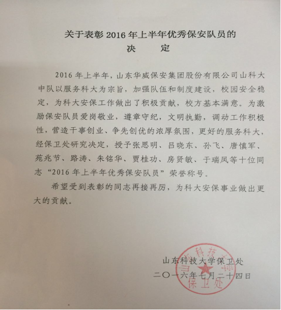 7月25日上午,山東科技大學保衛處對2016年上半年優秀保安隊員進行了表彰,青島分公司山東科技大學項目部十名保安隊員獲得榮譽稱號。