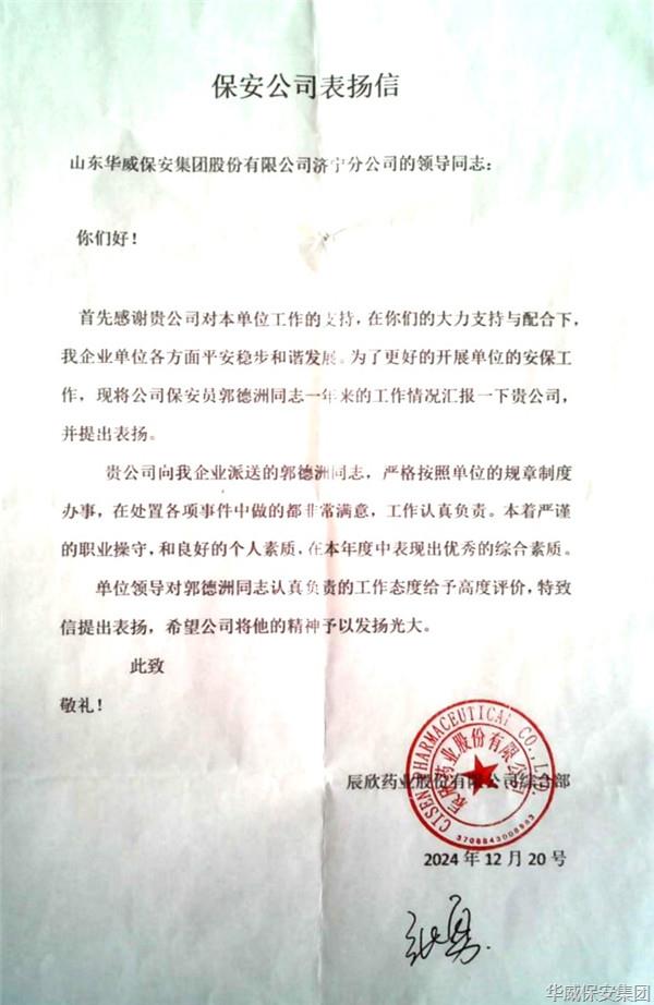 龍影漸遠辭舊歲,吉蛇獻瑞啟新程。新春之際,華威保安濟寧分公司,先后收到了來自客戶辰欣藥業、煙草公司配送庫的兩封表揚信,對駐勤華威保安團隊、保安隊員郭德洲一年來在...